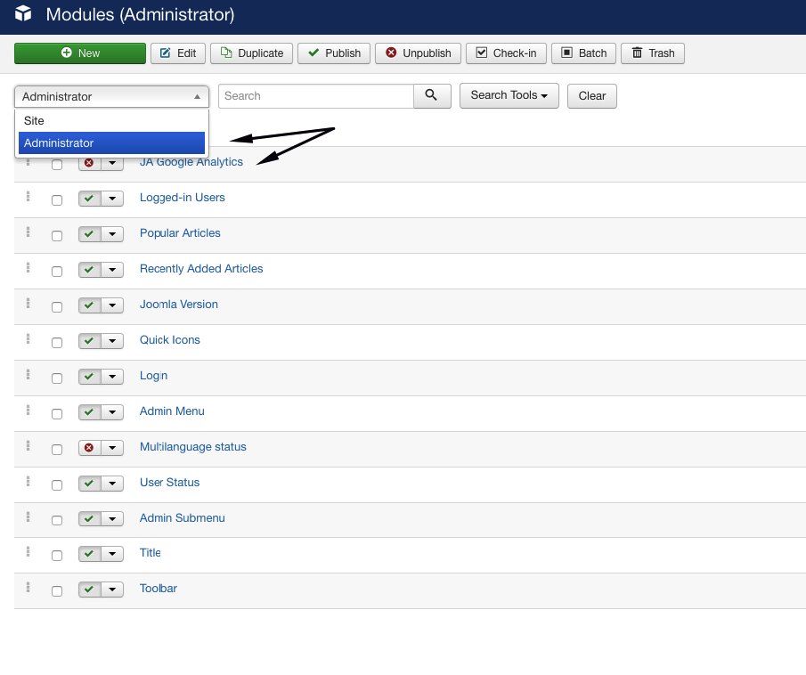 After you installed module then you need to enable it for admin side , go to modules and filter for Administrator ( look at image below )