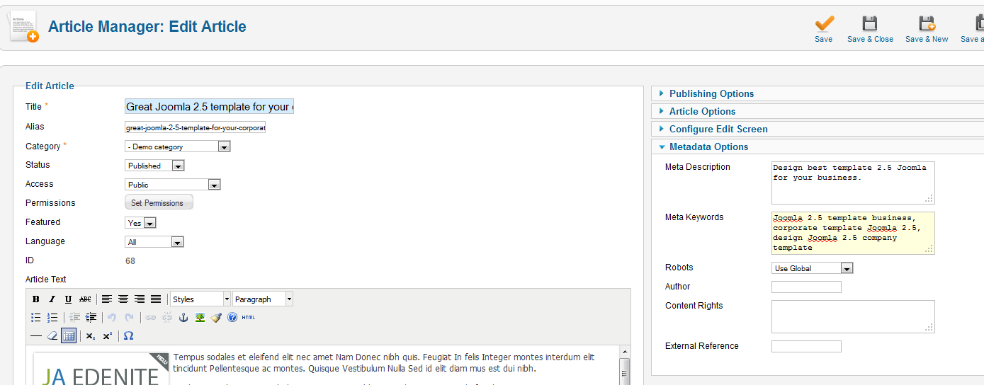 In edenite 2.5 demo the meta info is added in the global plus the article too.