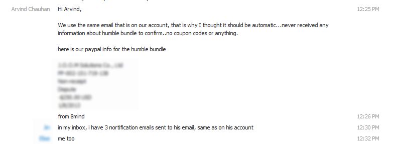 January 10, 2013 at 9:39 am #479234As i said, we would be more than happy to help you out with the humblebundle deal you have purchased once you withdraw your dispute and i also assured you that you would be refunded the other package you bought while waiting for the email.