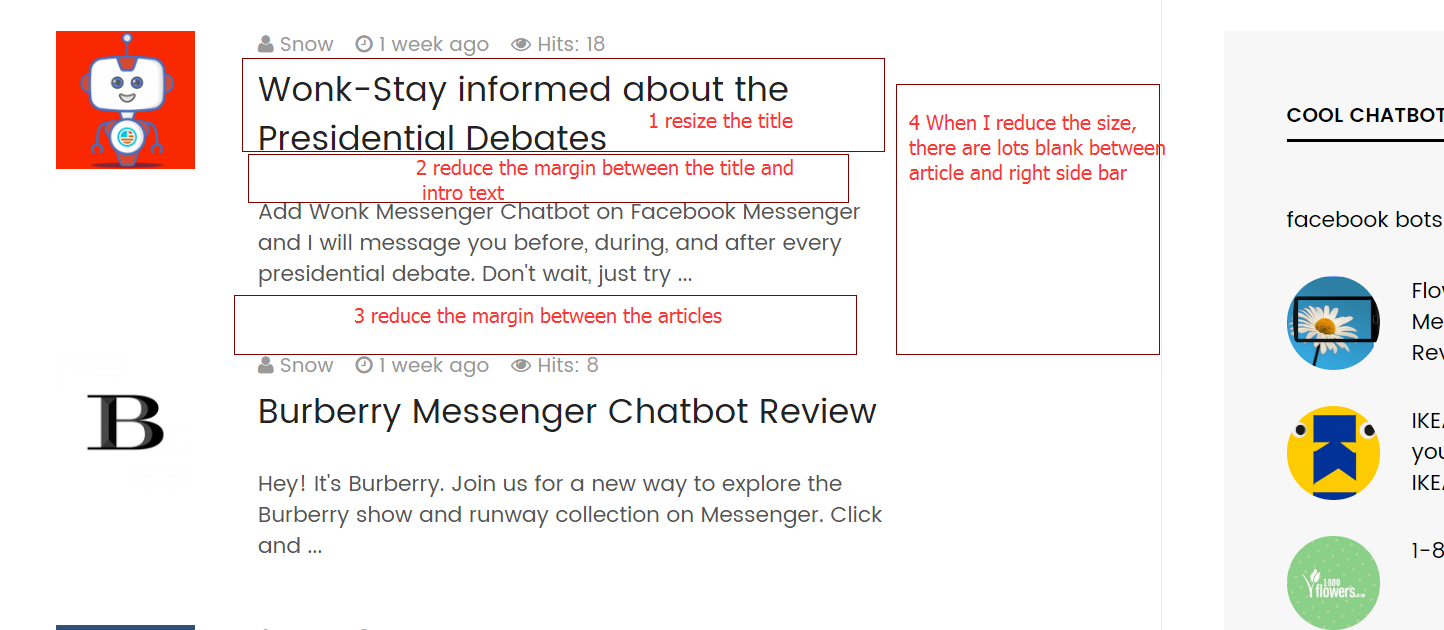 For article title and margin add below code in custom.css file and change the font size , line height and padding bottom value.itemid-102 .article-title, .article-header h1 { font-size: 22px!important; margin-bottom:20px!important; line-height: 1.428571!important; }For 4. point