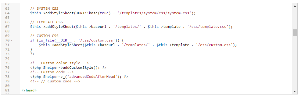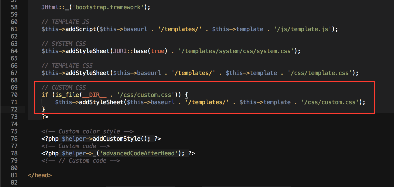 // CUSTOM CSS if (is_file(__DIR__ . '/css/custom.css')) { $this->addStyleSheet($this->baseurl . '/templates/' . $this->template . '/css/custom.css'); }