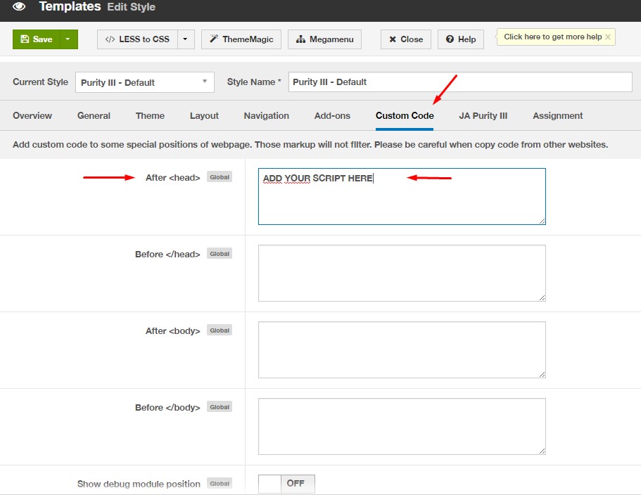 Edit your Purity_III template and in custom-code tab add your script before head tag.