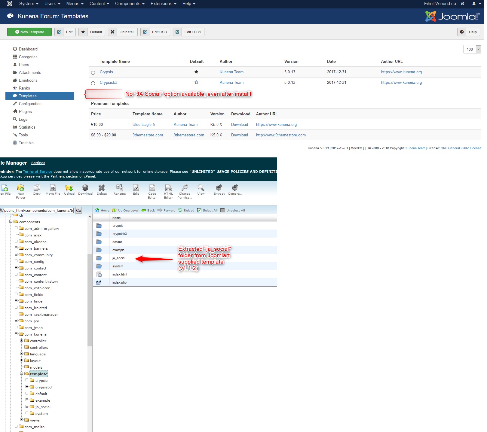 I’m trying to install the JA Social theme for my Kunena 5.0.13 component. I followed the instructions as seen on this page, and downloaded the latest copy of the template found here (1.1.2), however when I inserted the folder as instructed I still do not see "JA Social" appear in my list of available Kunena templates.