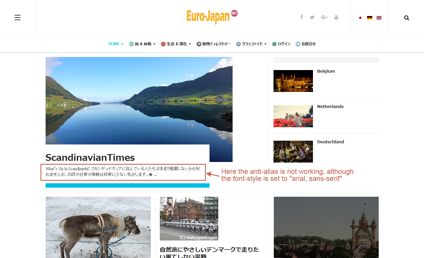 Screenshot (2) – http://www.euro-japan.net/index.php/jp/home-jp/857-scandinavia-timesOn the first page (screenshot 1), always serif-font without anti-alias is shown. It makes no difference even other fonts are manually selected.