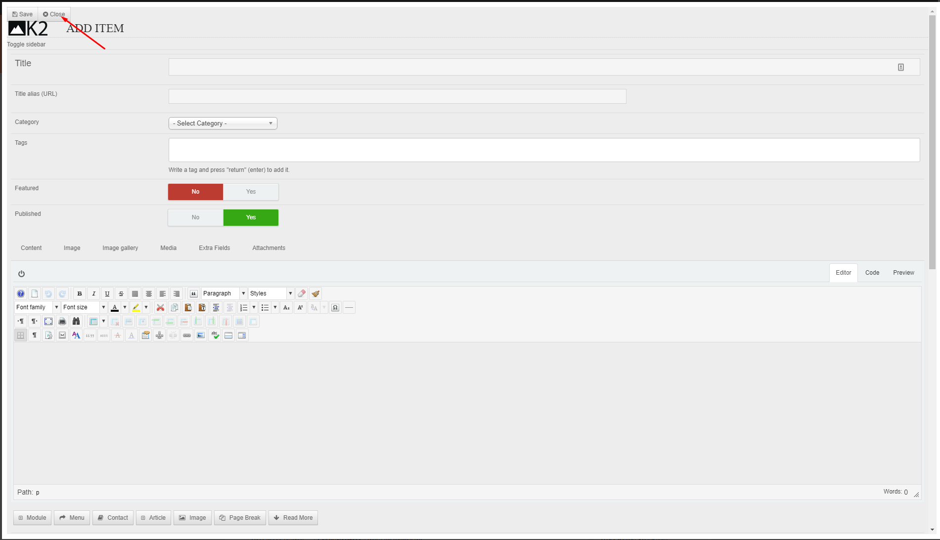 For the creating new k2 item, I just tried but both Save & Close button are working fine: http://prntscr.com/hcrfuz