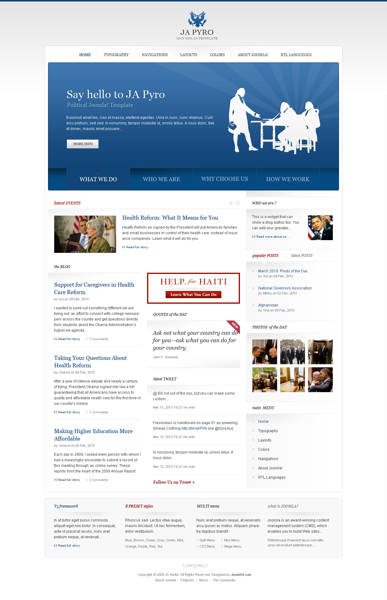JA Pyro is the May 2010 Template and below are the preview screenshots. its a totally different theme and can be easily adapted for political sites, however, change of images and you can make it work for any requirement. It will be available for download in the coming days.
