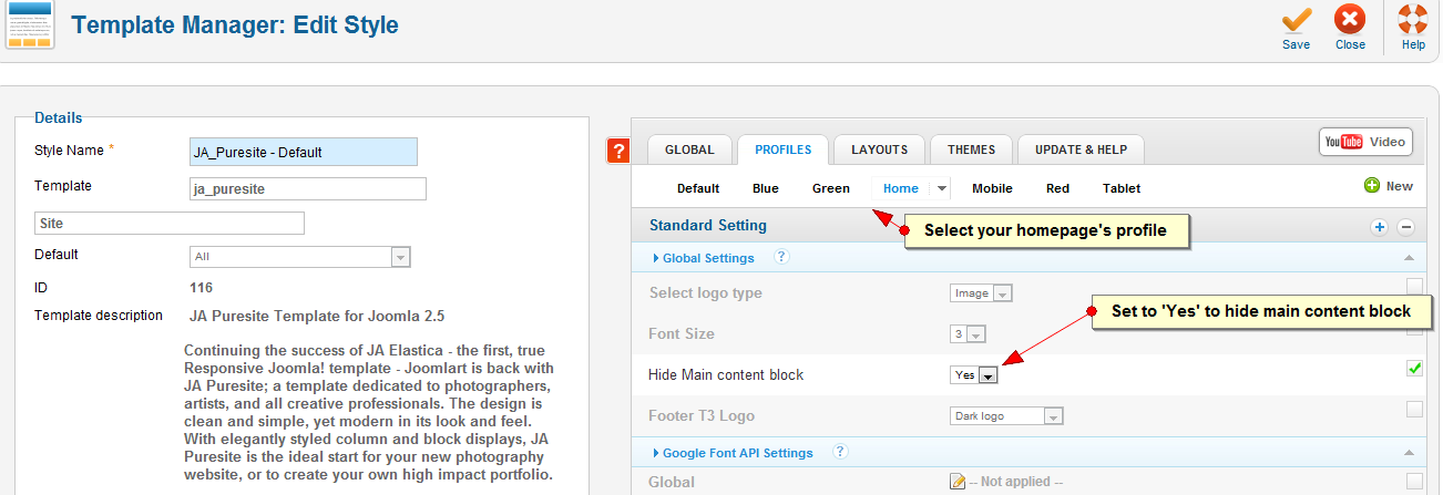 I checked the Home profile in the template manager and the “Hide main content block” option is set to Yes.