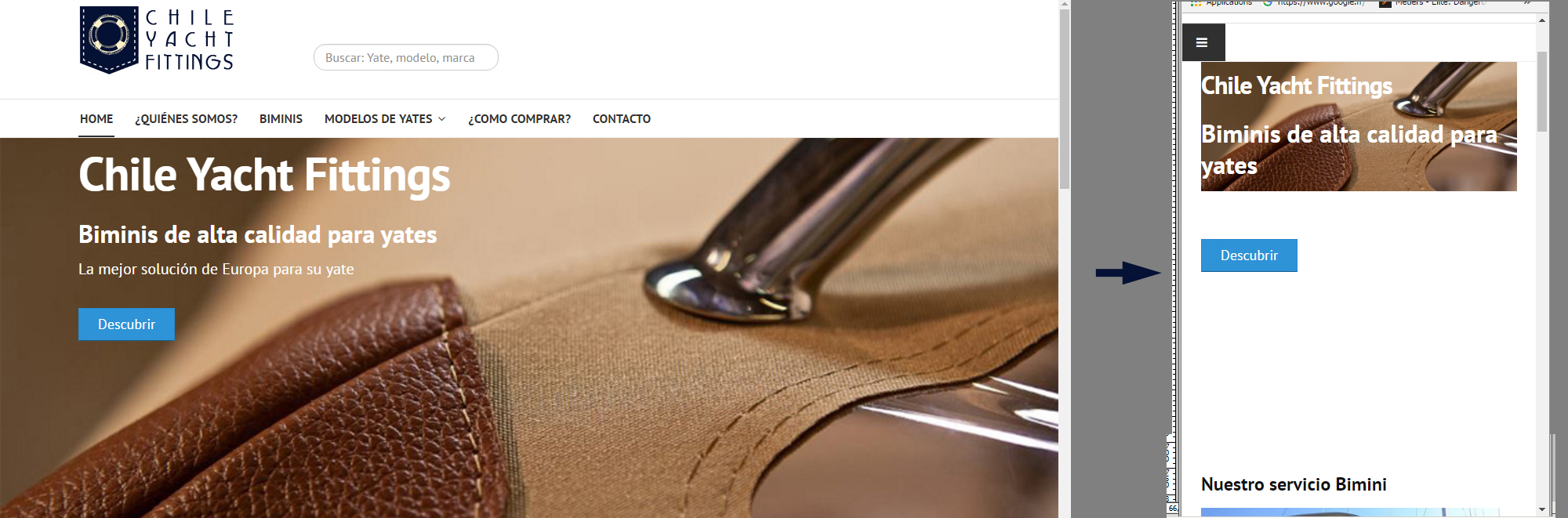 <div class="container" style="min-height: 500px;"> <div class="hero-unit text-left"> <h1>Chile Yacht Fittings</h1> <h2>Biminis de alta calidad para yates</h2> <p class="lead">La mejor solución de Europa para su yate</p> <a href="http://www.yachtfittings.cl/bimini" class="btn btn-primary btn-large" title="Sample link">Descubrir</a></div> </div>i m a bit disapointed:) If some one can put a eye on this? thank you very very much bye 🙂