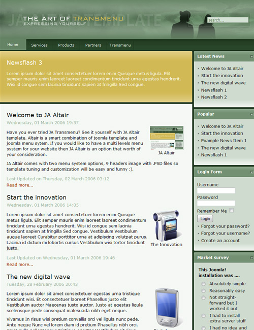 Have you ever tried JA Transmenu ? See it yourself with JA Altair template. JA Altair is a smart combination of joomla! template and joomla! menu system. If you would like to have a multi level menu system for your website, then JA Altair is an option worth your consideration.