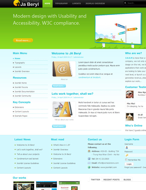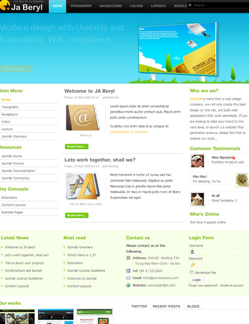 When stay longer with JA Beryl, you will note a modern and easy-to-customize web 2.0 concept giving you more chances for custom needs. Not like Ja Erica where each published item on the banner just changes upon each page refresh, JA Beryl supports advance slideshow solutionJA Slideshow 2 and more interactive extensions like JA Highslide, JA Tabs and JA Bulletin.